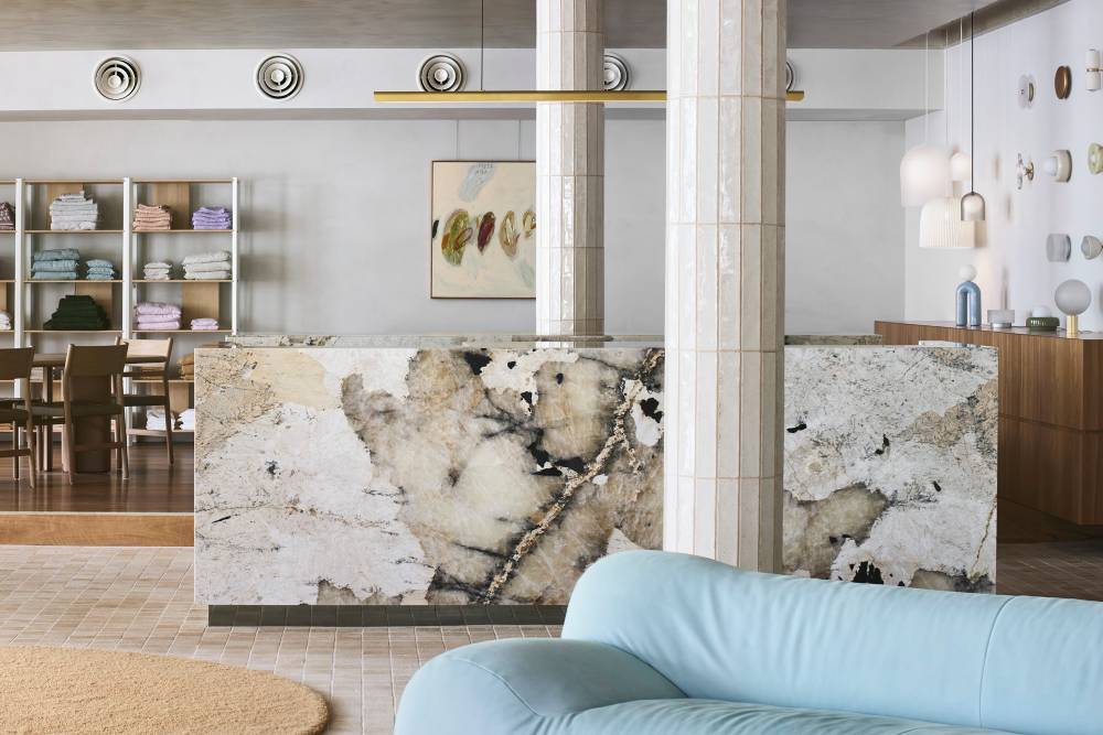 Детали из кварцитов сложных оттенков можно использовать как pop of color в лаконичных интерьерах, чтобы придать им индивидуальность и характер.