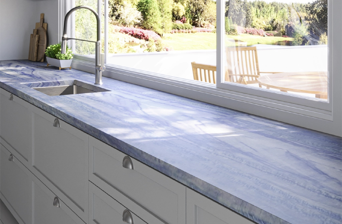 Кварцит Азул Империале это очень редкий бразильский кварцит голубого, а иногда и насыщенного синего цвета. В зависимости от конкретной партии Азул Империале может быть с более активным рисунком, напоминающим акварель, или практически без рисунка.