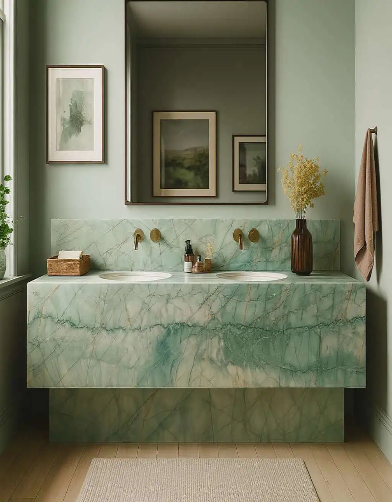 Бразильский кварцит Да Винчи это очень необычный и яркий камень! Насыщенный изумрудный оттенок и хаотичный природный рисунок превращают любое изделия из этого материала в настоящий арт-объект. Каждая партия этого кварцита отличается глубиной цвета, частотой рисунка, поэтому каждое изготавливаемое изделие уникальное.