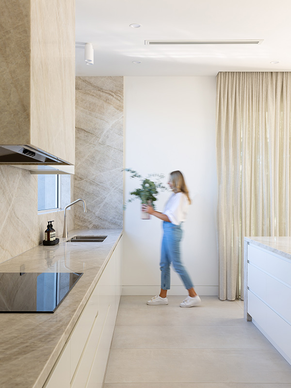 Среди кварцитов немало по-настоящему красивых материалов бежевых и кремово-белых оттенков. Использование одного кварцита теплого нейтрального оттенка делает любое помещение визуально боле светлым и просторным.