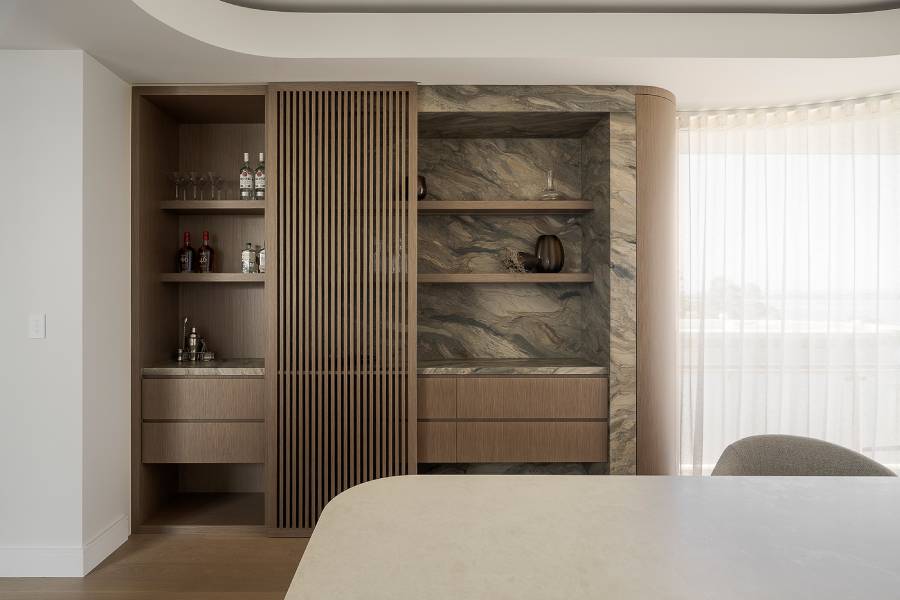 Если вы выбираете мебель яркого оттенка в интерьерах, то кварцит сложного темного цвета с замысловатым волнообразным рисунком подчеркнет этот оттенок. При этом мы не видим никакого "конфликта" между оттенком мебели и кварцитом!